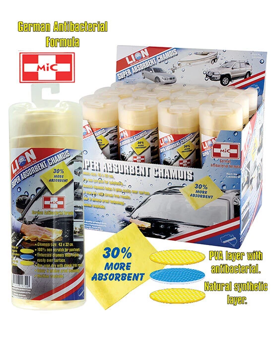 Super absorbent chamois. Size: 43 x 32 cm. 100% non scratch. Embossed chamois helps it glide easily over surface. One wipe dry with streak free results. Odour & mildew proof technology.