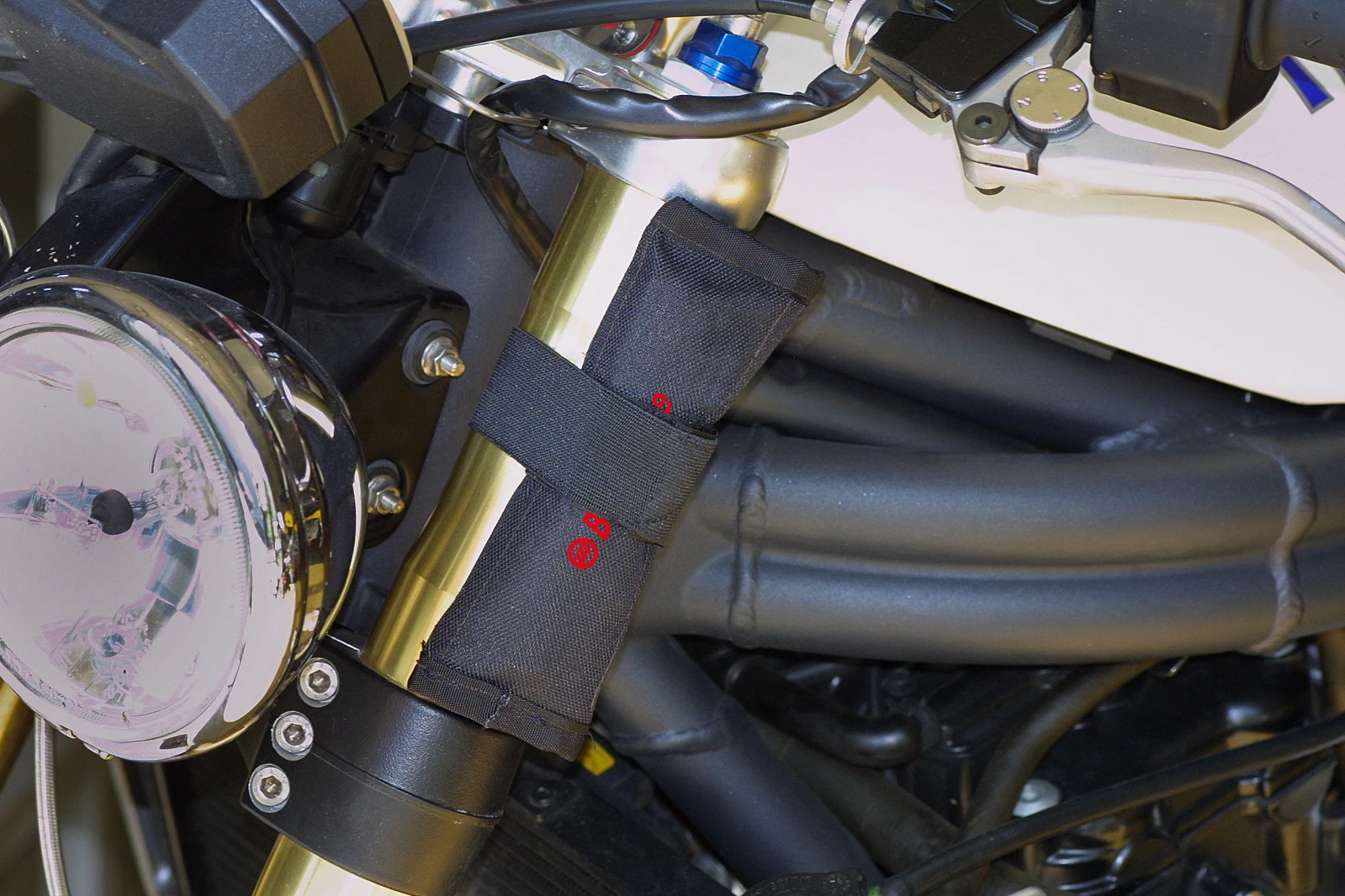 - Elastic strap with Velcro allows the pouch to be attached to the motorcycle.