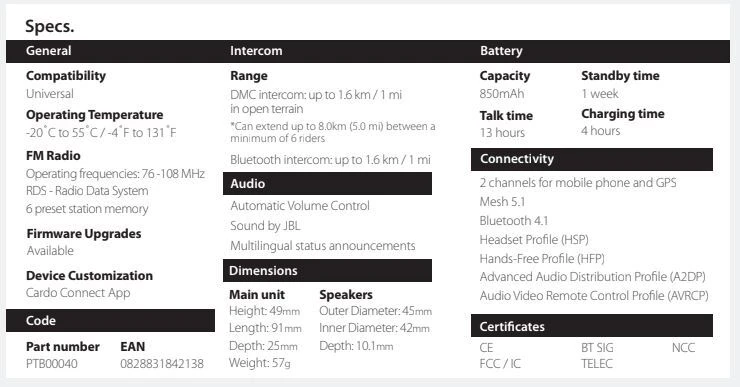 1-15 Riders, Universal Bluetooth connectivity. FM radio, full phone connectivity. Charge while riding, Automatic Colume Control, mobile conferencing, music & radio sharing, GPS, music streaming, natural voice operation, dual core technologies (DMC/Bluetooth), connectivity with two Bluetooth mobile devices, hybrid & corded mic, Parallel audio steraming, Cardo Connect App (iOS/Android), we left nothing out.