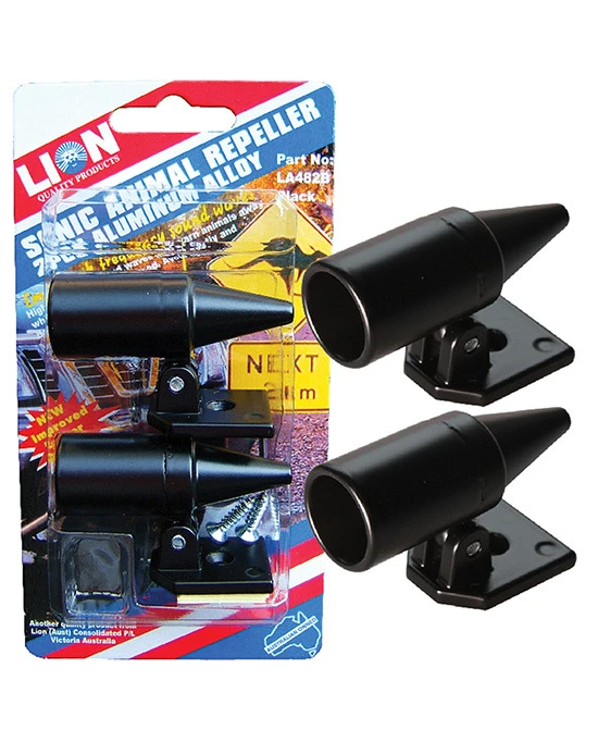 2 piece. Aluminium black alloy. Adjustable pitch control. Repeller emits a high frequency sound whilst vehicle is travelling at speed, warning animals of approaching vehicles. Avoid costly repairs and fit these cost effective and easy to fit repellers.