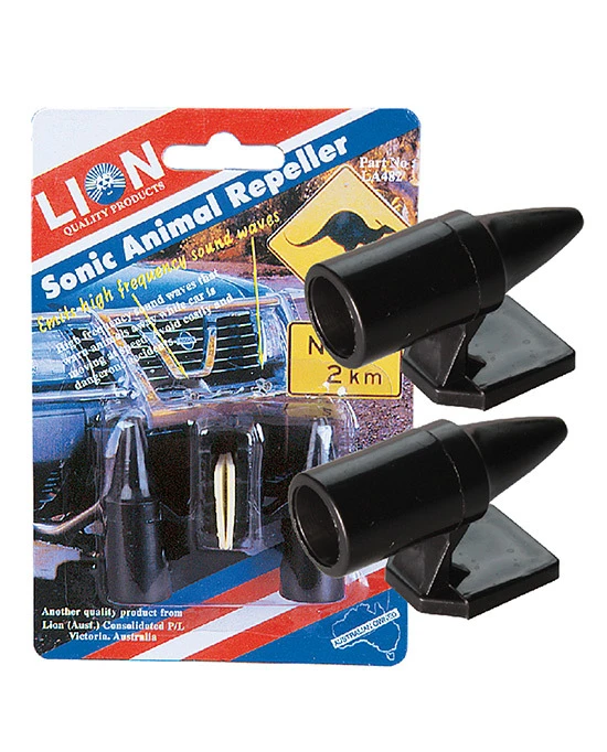 2 piece. Plastic, black. Stick on. Repeller emits a high frequency sound whilst vehicle is travelling at speed, warning animals of approaching vehicles. Avoid costly repairs and fit these cost effective and easy to fit repellers.
