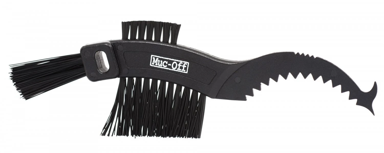 The Muc-Off Claw Brush boasts a high quality construction with three brush heads that feature tough nylon bristles and an integral scraper for mud de-clogging. Its perfect for cleaning your bikes chain, cassette, mechs and sprockets.