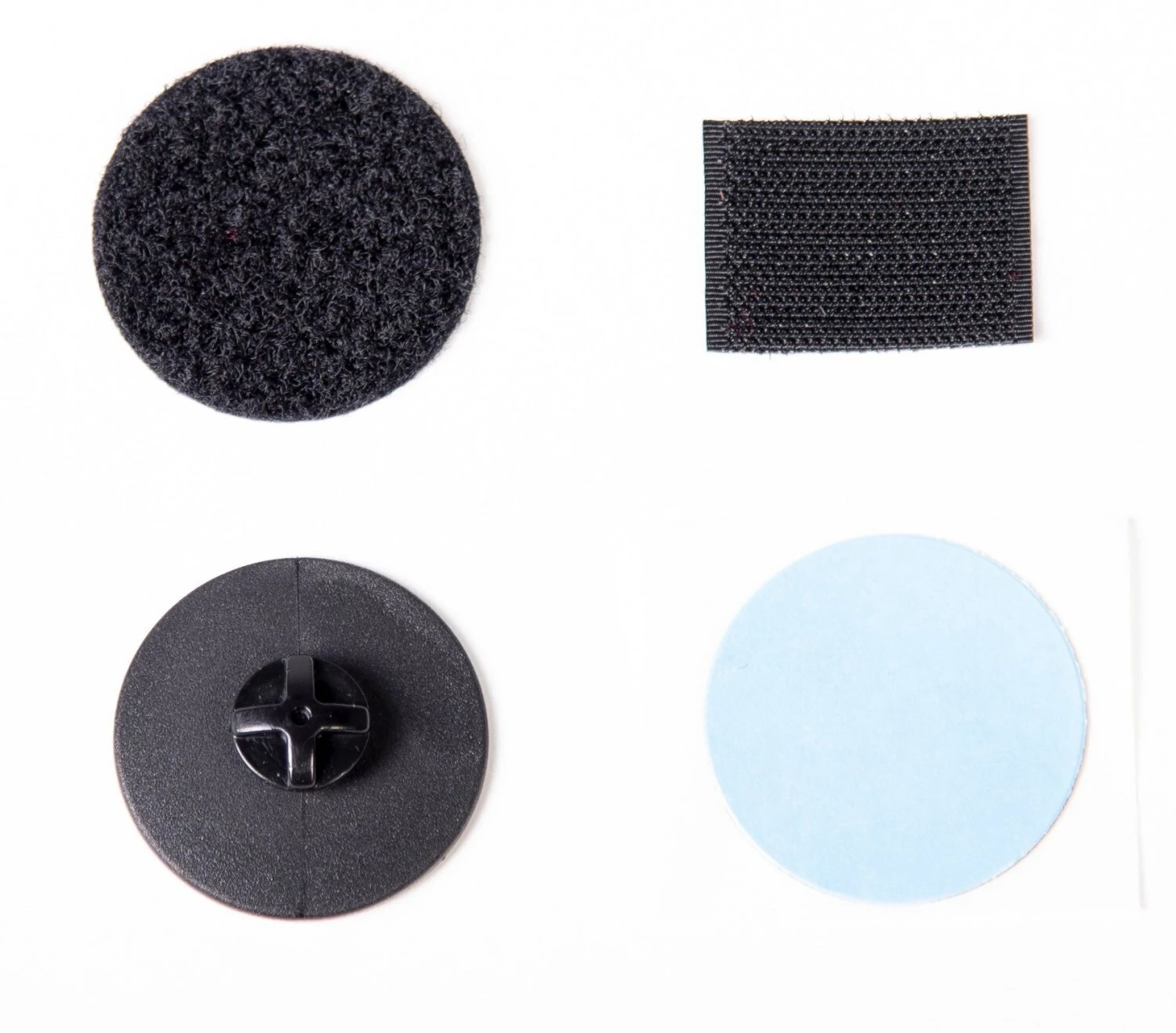 All the pieces you need to remount your complete Quick Strap System: hook-and-loop closure, plastic swivel button and adhesive